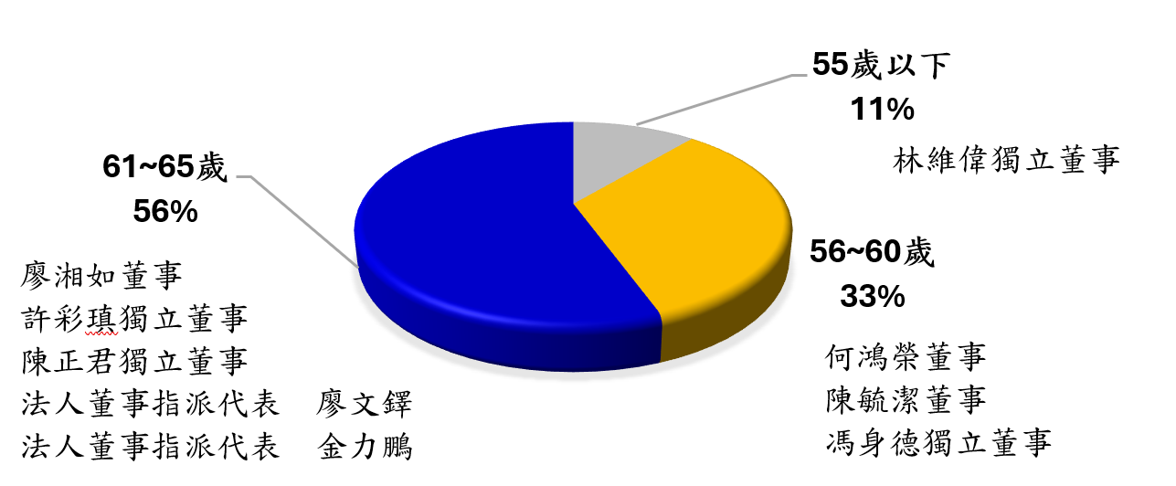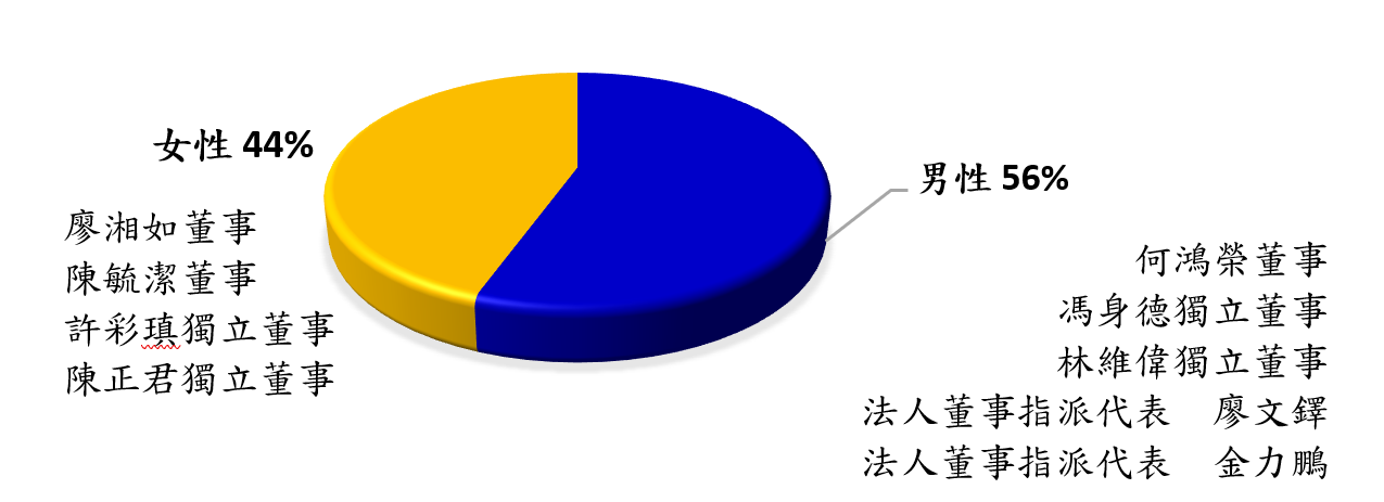 現任董事會成員中已包含兩位女性獨立董事(許彩瑱獨立董事、陳正君獨立董事)佔全體獨立董事比率50%;以及兩位女性董事(廖湘如董事,陳毓潔董事),佔一般董事比率40%。全體董事中女性董事佔比為44%。
