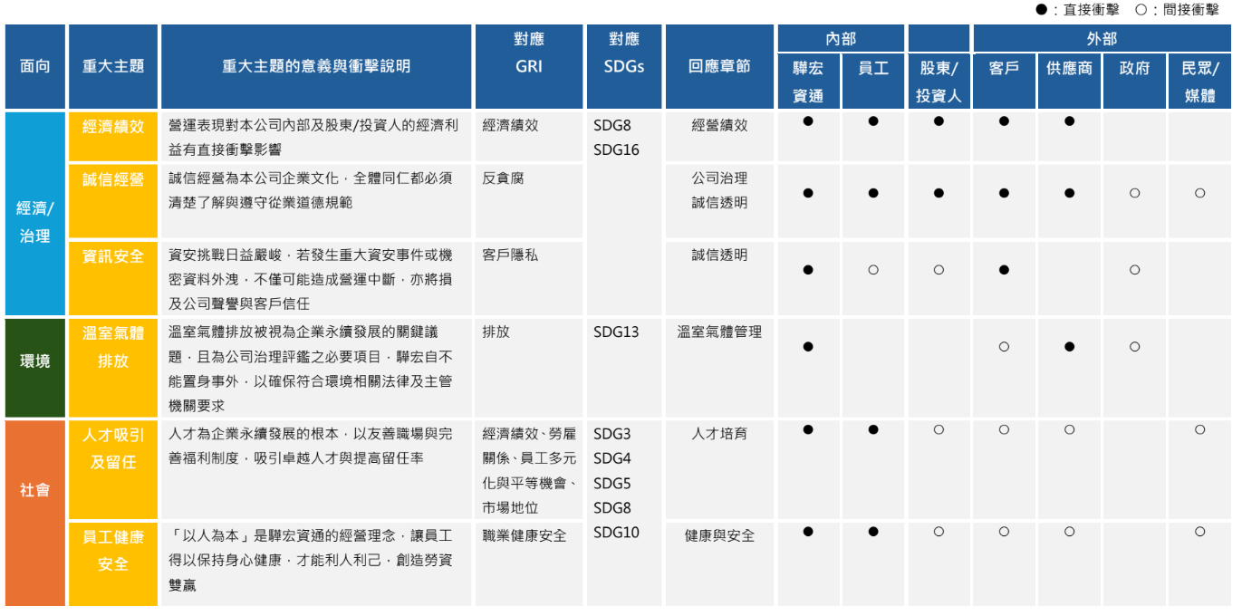 驊宏資通參考全球永續性報告協會(Global Reporting Initiative, GRI)發布之2021版GRI準則(GRI Standards 2021),辨識重大議題,並依循GRI 3重大主題(GRI 3: Material Topics 2021)建構重大議題分析流程,評估本公司在重大議題對環境、經濟與人群(包含人權)的正負面衝擊程度。