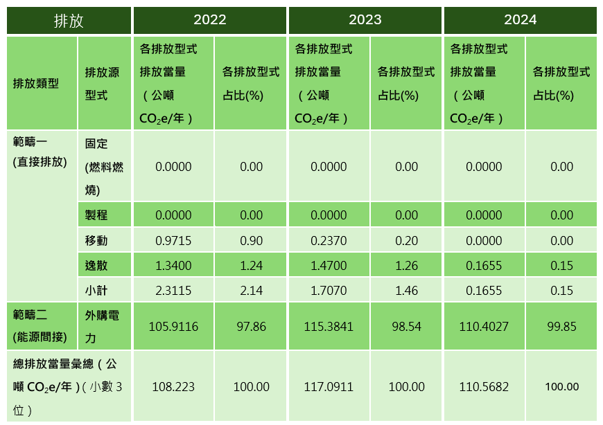 2022-2024年之排放情形如下。(相關數據涵蓋範圍為驊宏資通總公司)此外,2024年溫室氣體排放密集度為:0.82 (公噸CO2e/人)及0.201 (公噸CO2e/新臺幣百萬元)。