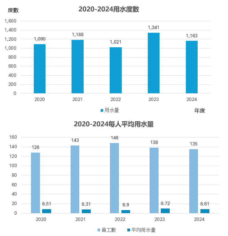 年用水量的使用情形,一如年用電量,2020-2022三年間,呈下降趨勢,2023年則呈上揚。2023年用水量為1,341度,較2022年增加320度,微幅上升2.94%。2024年則為1,163度,較前一年減少178度,略降13.27%。此外,廢水之排放於2024年度無發生任何違反法規而受裁罰之行為事件。以上相關數據涵蓋範圍為驊宏資通總公司。