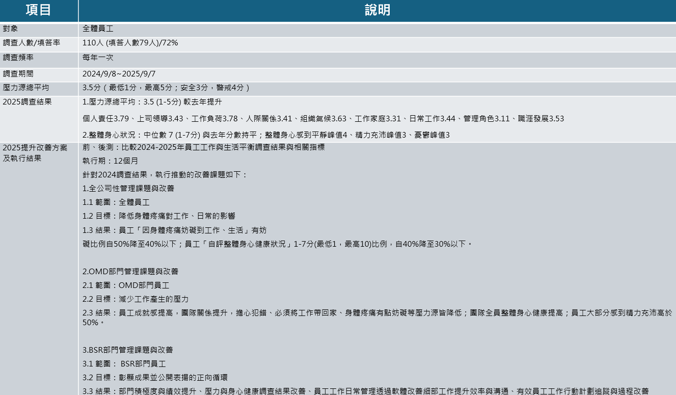 本公司人才策略中心於2020年起,固定於每年執行員工工作生活平衡調查,以求在變動的環境下,了解員工組織適應與組織氣候、員工身心健康狀況,並透過經理人培育計畫,讓部門主管與潛力人才針對重大問題進行深度溝通和訪談與訂定改善計畫,目標是讓組織在變動的環境中,主管與同仁團隊即時應變,創造組織與員工雙贏。六年來員工覆蓋率為 70-100%,仍然維持相當水準。員工壓力狀況持續改善從3.9降至今年3.5 (最低1分,最高5分;安全3分,警戒4分)。同時,管理效能與員工有感改善計畫,於每年提出公司層級1個與部門層級2-4個雙贏改善計畫,每年成功方案約有3-5件,計畫持續不斷地增進團隊管理能力並能發展因應新時代潮流的做法,與員工共同發展組織。